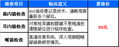 2、 每日前20名由中国五官基金会提供耳鼻喉内窥镜筛查援助,三项检查援助价85 元。