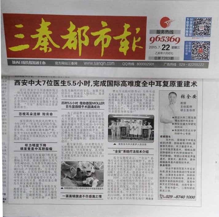 (摘自:三秦都市报2015年7月22日 记者:周盟芽)风华正茂的他还没有来得及好好享受生活,就被病魔推下了重度耳聋的险境;事业刚刚起步的他还没来得及施展自己的理想和抱负,就被病魔纠缠奔波于大小医院;然而绝望的他被7位医生、一台进口设备,改变了命运……
